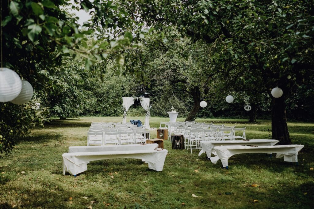 • Möblierungspauschale (inkl. Trautisch, Stehtische, Bänke, Hussen)